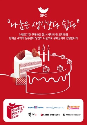 SPC그룹 관계자는 "이번 캐치 프레이즈는 회사명인 'SPC'라는 이니셜로 나눔의 의미를 간결하게 풀어 소비자들이 기억하기 쉽게 만들었다"며 "크리스마스 시즌은 케이크가 많이 팔리는 시기인 만큼 많은 사람들의 참여가 기대된다"고 전했다.