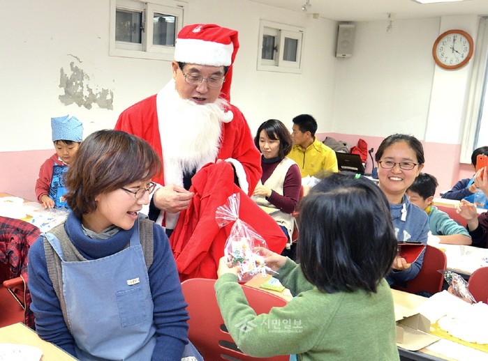 [시민일보]23일 산타크로스 복장을 한 문충실 서울 동작구청장이 동작어린이 도서관 지하강당을 방문해 어린이들과 성탄의 기쁨을 나눴다. 사진은 산타 복장의 문 구청장이 어린이들에게 사탕을 나눠주고 있는 모습.