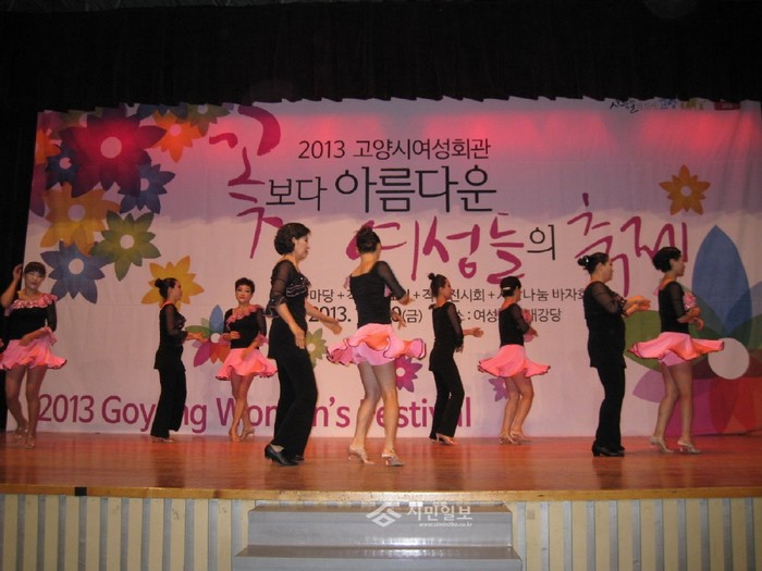 [시민일보]경기 고양시 여성회관은 최근 '꽃보다 아름다운 여성들의 축제'라는 이름으로 2013년도 작품발표회와 전시회, 사랑나눔 바자회를 개최했다. 이날 행사에는 500여명의 시민들이 참여했으며 10개반의 수강생들은 그동안 갈고닦은 솜씨를 무대에 올렸다. 사진은 여성회관 댄스스포츠반 수강생들의 공연 모습.