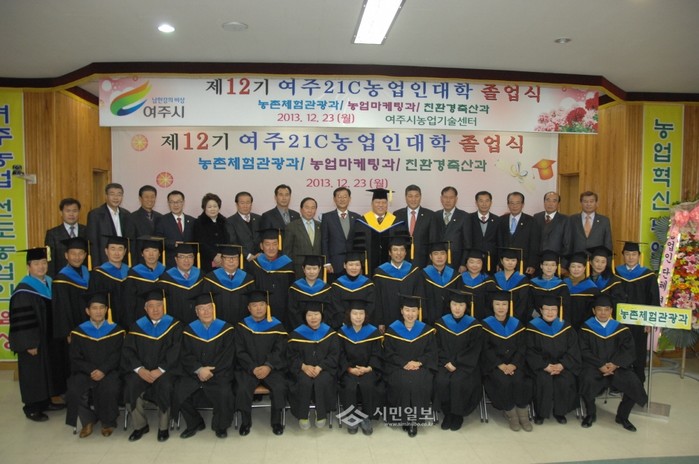 [시민일보]여주시농업기술센터는 지난 23일 김춘석 농업인대학 총장과 졸업생 등 130여명이 참석한 가운데 제12회 졸업식을 개최했다. 졸업식에서는 2013년 여주21C농업인대학 농촌체험관광과 등 3개 과정에서 교육과정을 이수한 86명의 교육생들이 졸업장을 받았다. 사진은 졸업자 및 김 총장, 관계자들의 단체촬영 모습.