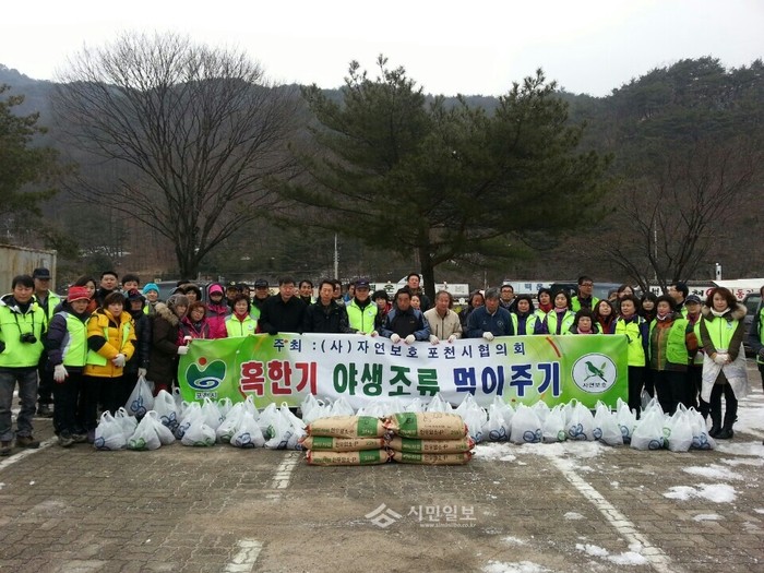 [시민일보](사)자연보호 포천시협의회는 지난 26일 경기 포천시청 관계자와 함께 포천시 이동면에 위치한 백운계곡 일대에서 겨울철 먹이가 부족해 굶어죽는 야생조류를 보호하기 위해 사료 500kg을 살포했다. 사진은 먹이주기 행사에 참여한 봉사자들의 기념촬영 모습.