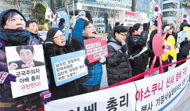 평화와통일을여는사람들 회원들이 27일 오후 서울 종로구 중학동 일본대사관 앞에서 열린 ‘아베 총리 야스쿠니 신사참배 규탄, 집단적 자위권 행사 기정사실화하려는 일본 규탄 기자회견’에서 구호를 외치고 있다.