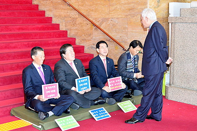 민주당 김한길 대표가 27일 오후 서울 여의도 국회 로텐더홀 계단에서 쌀 목표가격 합의를 촉구하며 농성 중인 국회 농림축산해양수산위원회 소속 야당 의원들을 격려하고 있다.