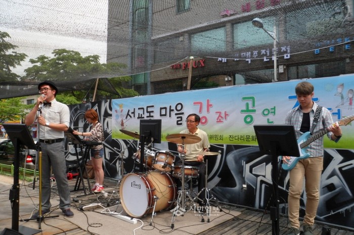 | ▲ 지난해 5월 서교동 강공장 축제 때 홍대 앞 걷고싶은 거리 야외무대에서 펼친 공연 중 드러머로 나선 장종환 서교동장 모습. | ||