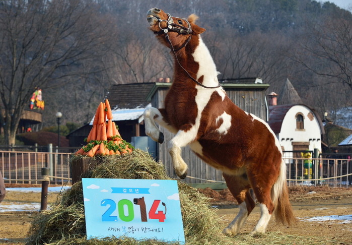 2014년 갑오년 말의 해를 이틀 앞둔 지난 30일 오전 경기 용인 에버랜드 동물원의 셔틀랜드 포니 '포롱이'(15세, 암컷)가 214개의 당근과 파슬리, 건초 등으로 만든 당근탑 케이크를 앞에 두고 힘차게 뛰어 오르고 있다. 사진=에버랜드 제공