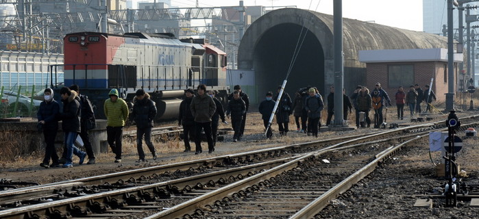 철도노조 조합원들이 총파업 투쟁을 현장투쟁으로 전환한다고 밝히며 업무 복귀를 선언한 가운데 31일 오전 서울 마포구 상암동 한국철도공사수색차량기지에 노조원들이 철길을 따라 걸어오고 있다.