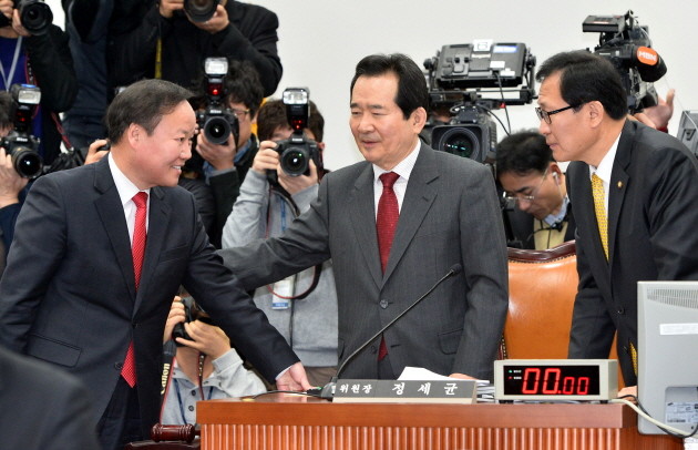 31일 오전 서울 여의도 국회에서 열린 국가정보원등 국가기관의 정치적 중립성 강화를 위한 제도개선 특별위원회 전체회의에서 정세균 위원장과 김재원 새누리당 간사, 문병호 민주당 간사가 대화를 나누고 있다. 이날 여야는 국가정보원법 일부개정법률안 등 7개 법안을 의결했다.
