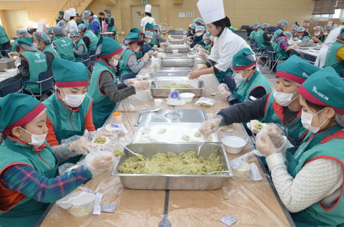 서울 구로구가 지난달 28일 구청 5층 강당에서 새해맞이 찾아가는 이동푸드마켓 행사를 열었다. 행사에는 하나금융그룹, (사)함께하는 사랑밭, 서서울생활과학고 조리과 봉사자 등 150여명이 참여했다. 사진은 만두를 빚고 있는 참가자들의 모습.