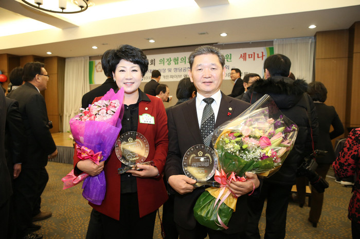 서울 종로구의회 박노섭 운영위원장과 강민경 의원이 지난 27일 송파구 문정동의 가든파이브 웨딩컨벤션에서 제1회 지방의정 봉사대상을 받았다. 사진은 수상 후 기념사진을 촬영하고 있는 박 위원장(오른쪽)과 강 의원의 모습.