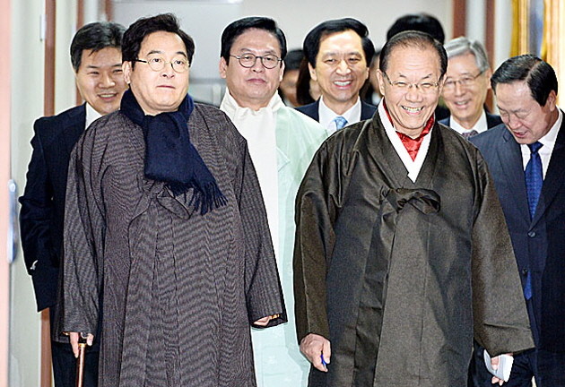 새누리당 황우여 대표, 심재철, 정우택 최고위원이 2일 오전 서울 여의도 당사에서 열린 최고위원회의에서 한복을 입고 참석하고 있다.