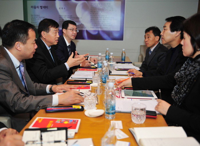 지난 2일 후스민(왼쪽 가운데)을 비롯한 중국 상해시 민행구 대표단이 송파구의 선진행정 및 주민자치 기능을 지닌 동 주민센터 운영 노력 등을 벤치마킹하기 위해 구청을 방문했다. 사진은 민행구 대표단들이 구청 관계자들과 면담하는 모습.