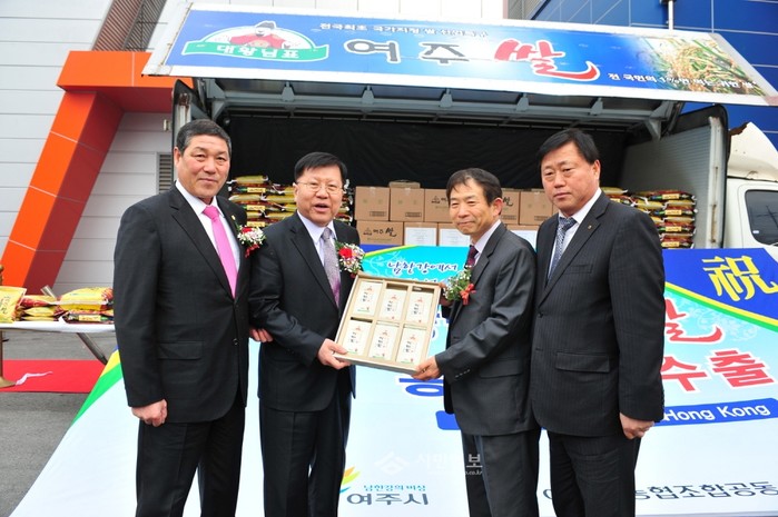 [시민일보]지난 3일 오전 경기 여주농협통합RPC 광장에서 대왕님표 여주쌀의 첫 홍콩수출을 기념하는 출고식 행사가 열렸다. 홍콩으로 수출된 쌀은 이달 말부터 홍콩 내 백화점 및 마트에서 판매될 예정이다. 사진은 출고식에 참여한 김춘석 여주시장(왼쪽 두번째)과 관계자들의 모습.