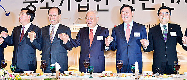 김기문(왼쪽부터)중소기업중앙회장, 새누리당 황우여 대표, 민주당 김한길 대표, 새누리당 최경환 원내대표, 민주당 전병헌 원내대표가 6일 오전 서울 여의도 중소기업중앙회에서 열린 2014 중소기업인 신년인사회에서 손을 맞잡고 있다.