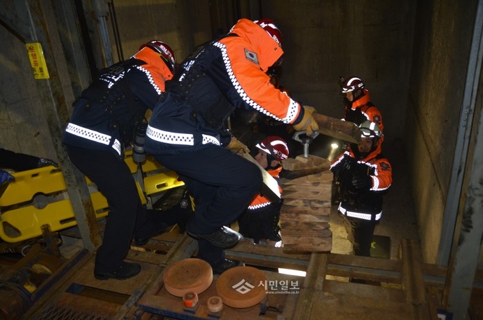[시민일보]서울 강남소방서는 지난 4일 삼성동 소재 건물 주차장 카리프트에 끼인 요구조자 1명을 구조했다. 이 사고는 건물 지하 4층에서 고장수리 작업중 카리프트 무게추에 깔린 사고로 구조대가 에어백을 이용해 구조, 병원으로 신속히 이송했다.
