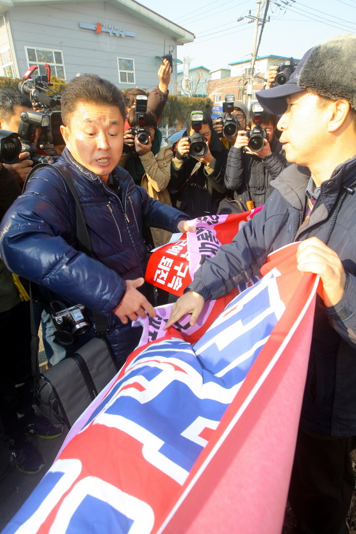 6일 오후 경기 화성 천주교 수원교구 기산성당 앞 도로에서 성당 관계자들과 대한민국수호 천주교인모임 등의 회원들이 말다툼을 벌이고 있다. 이날 기산성당에서는 수원교구 공동선실천사제연대와 천주교 정의구현 수원교구 사제단이 '관권 부정선거 진상규명 및 현 정권의 회개와 퇴진을 촉구하는 수원교구 시국미사'를 진행됐다.