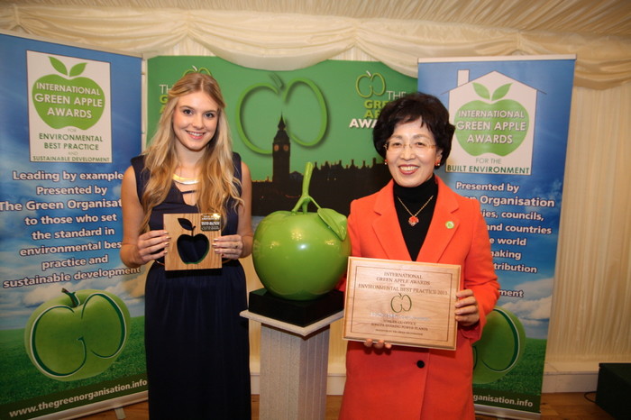| ▲ 인터내셔널 그린애플 어워즈를 수상하고 있는 박춘희 송파구청장(오른쪽) | ||