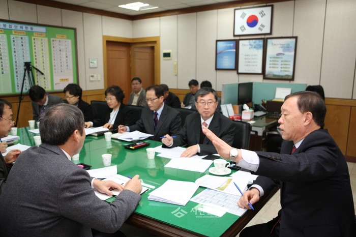 [시민일보]경기 가평군은 7~9일 갑오년 새해를 맞아 효율적인 군정운영과 주민들의 참여를 확산하기 위해 읍·면 방문을 실시해 읍·면장으로부터 주요업무 및 현안사항을 보고받고 주민들과의 대화를 실시했다.. 사진은 가평읍을 방문한 김성기 군수가 회의를 진행하는 모습.