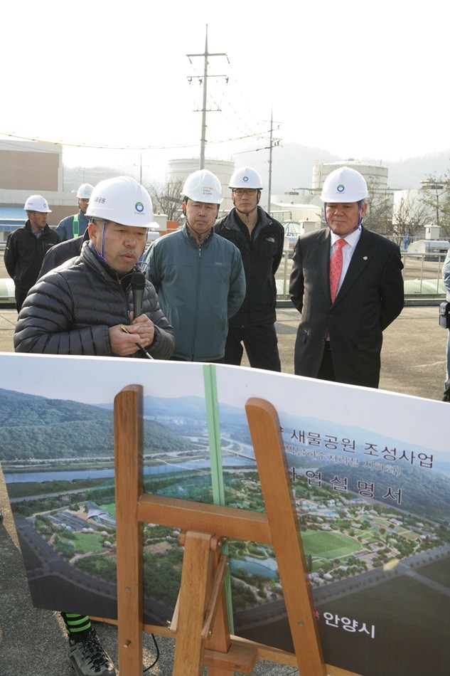 [시민일보]지난 6일 박달하수처리장을 지하화해 지역 환경을 개선하고 하수에서 발생하는 메탄가스를 활용해 전기를 생산하는 시설을 조성하는 새물공원조성사업 공사 현장을 방문해 관계자들을 격려했다. 사진은 공사 관계자로부터 진행상황을 설명받고 있는 최대호 안양시장의 모습.
