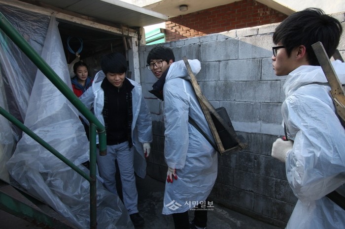 [시민일보]지난 4일 인천 남구 부개고등학교 학생들이 자체 모금과 KB금융그룹으로부터 받은 후원금을 합쳐 연탄 2200장을 구입해 지역내 저소득층 노인 가구에 기부하고 직접 전달했다. 사진은 연탄을 나르는 부개고등학교 학생들의 모습.