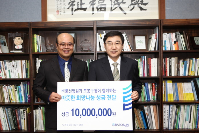 서울 도봉구 창동에 있는 바로선병원이 도봉구가 진행하는 ‘2014 희망온돌 따뜻한 겨울나기 사업’을 위해 지난 7일 성금 1000만원을 전달했다. 바로선병원은 2005년 개원 이래 연탄지원, 무료수술 등 다양한 사회활동을 전개해 사회의 귀감이 됐다. 사진은 바로선병원 진건형 대표원장(왼쪽)과 이동진 도봉구청장(오른쪽)이 기념촬영을 하는 모습.