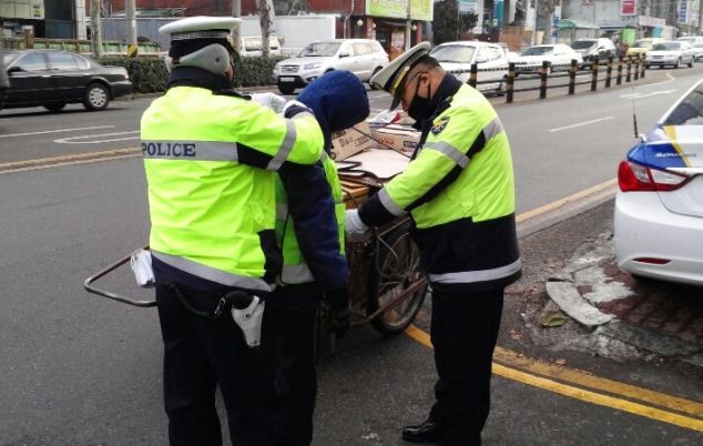| ▲ 남부서 직원들이 폐지수집 어르신에게 야광조끼를 입혀주고 있다. | ||