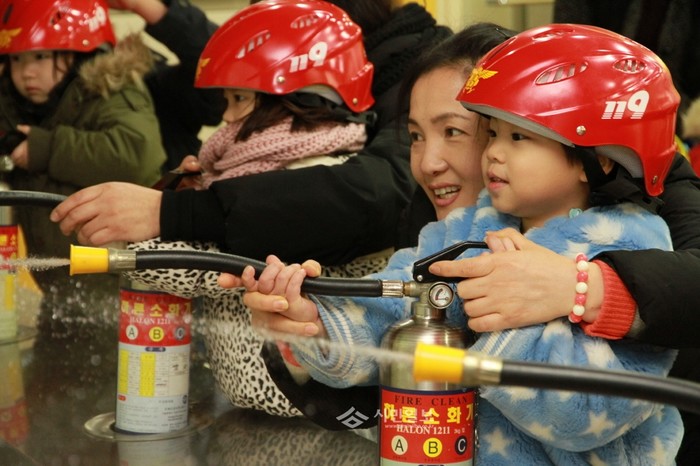 [시민일보]서울 구로소방서는 9일 오전 본서 3층 소방안전체험교실에서 예랑어린이집 유치원생과 지도교사들을 대상으로 ‘1일 병아리 소방관’ 체험학습을 했다. 사진은 가상화재 진화체험을 하고 있는 어린이의 모습.