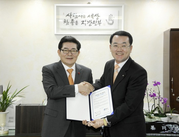 [시민일보]광진구는 9일 구청장실에서 '신한은행과 함께하는 아름다운 나눔 자원봉사 협약식'을 개최했다. 사진은 김기동 구청장(왼쪽)과 박종배 신한은행 강동지점 본부장이 협약 체결 후 기념사진을 촬영하는 모습.