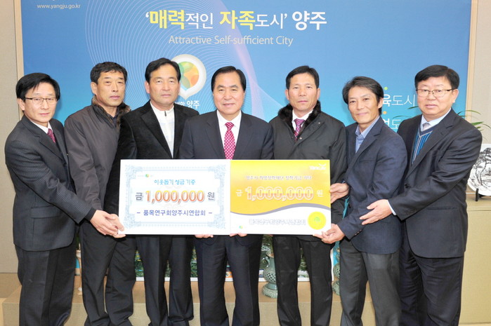 품목연구회양주시연합회(회장 안광용)는 지난 8일 양주시청을 방문해 현삼식 양주시장을 접견하고 지난해 재배한 콩과 고구마를 팔아 마련한 수익금 200만원을 불우이웃과 양주시 희망장학재단에 100만원씩 기탁했다. 사진은 성금 전달 후 품목연구회 관계자들이 기념촬영을 하는 모습.