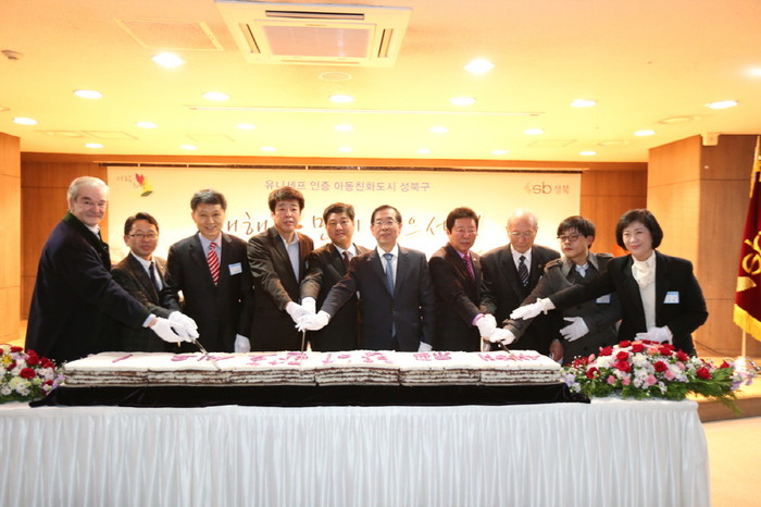 [시민일보] 서울 성북구가 8일 신년인사회를 개최해 전국 최초 유니세프 어린이 친화도시에 선정에 이어 어르신까지 전 세대를 아우르는 살맛나는 도시로 도약하고자 하는 2014년 성북호의 출정식을 응원했다. 사진은 김영배 성북구청장(왼쪽 다섯번째), 박원순 서울시장(오른쪽 다섯번째) 등 내빈들이 축하떡을 자르고 있는 모습.
