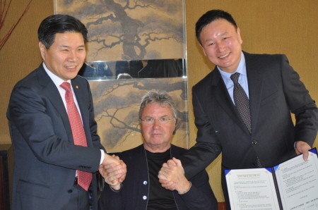 | ▲ 업무협약식을 마친 홍문종 총재, 거스히딩크 명예이사장, 허정무 이사장이 손을 잡고 기념촬영을 하고 있다. | ||