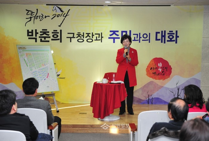 [시민일보]13일 박춘희 송파구청장이 잠실4동 잠실초등학교에서 '2014년 박춘희 구청장과 주민과의 대화'를 열었다. 사진은 주민과의 대화에서 주민들의 불편사항에 대해 듣고 직접 답변하고 있는 박 구청장의 모습.