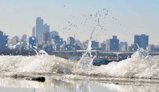 중부와 남부 일부 지역에 한파 특보가 발효 중인 13일 오후 서울 마포구 서강대교 북단 밑에서 얼어붙은 얼음덩이에 한강 물이 부딪쳐 큰 파도를 만들고 있다.