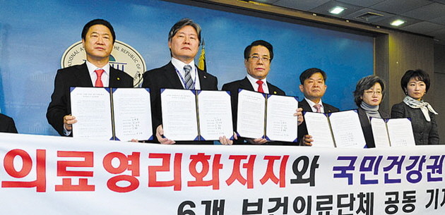 14일 오후 서울 여의도 국회 정론관에서 열린 의료영리화 저지와 국민건강권 수호를 위한 6개 보건의료단체 공동 기자회견에서 참석자들이 보건의료 상업화 저지를 위한 의약5단체 및 보건의료노조 공동협의회에 대한 서명서를 들고 있다. 왼쪽부터 김세영 대한치과의사협회장, 노환규 대한의사협회장, 조찬휘 대한약사회장, 김필건 대한한의사협회장, 유지형 전국보건의료산업노동조합 위원장, 이언주 민주당 의원.