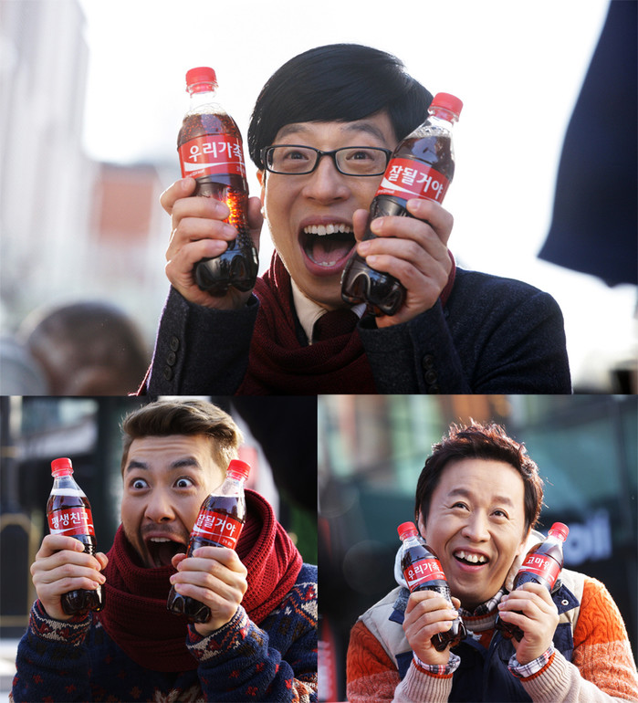‘유재석·정준하·노홍철’의 V라인 대결을 엿볼 수 있는 ‘코카-콜라 행복편’ 광고는 평소 어색하고 쑥스러워 전하지 못했던 마음을 ‘닉네임’과 ‘메시지’로 라벨링된 코카-콜라로 전하자는 내용을 담고 있다.