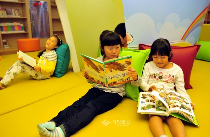 | ▲ 송파 ‘글마루도서관‘에서 옹기종기 모여 벽이나 쿠션에 기대고 자유롭게 책을 읽고 있는 아이들. | ||