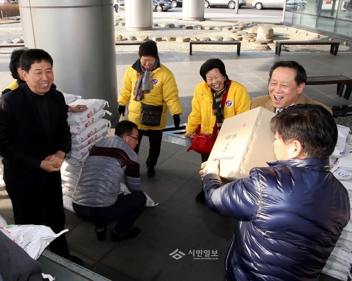[시민일보]금천구는 지난 15일 구청광장에서 대한적십자사로부터 설맞이 사랑의 구호품을 전달받았다. 구호품은 지역의 홀몸노인, 조손가정 등 경제적 어려움을 겪고 있는 소외계층 352가구에 전달할 예정이다. 사진은 구호품을 직접 전달받는 차성수 금천구청장(오른쪽 두번째) 모습.