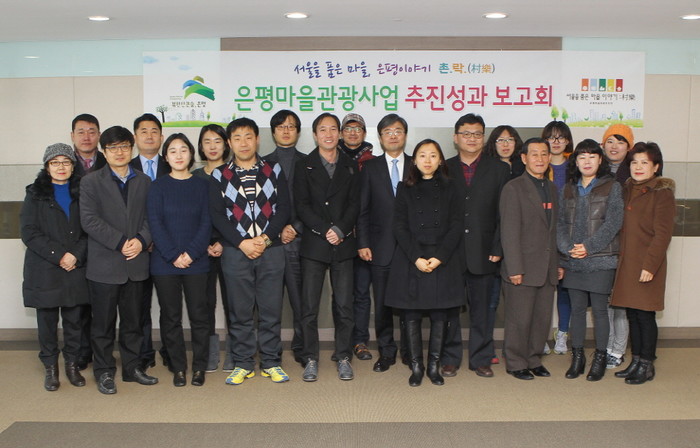 지난 14일 서울 은평구가 1박2일의 산새·산골마을 관광상품 개발을 완료하고 구 관계자 및 사회적기업, 주민들이 함께 마을관광사업추진성과 보고회를 개최했다. 사진은 보고회를 마친 김우영 구청장과 관계자들의 모습.