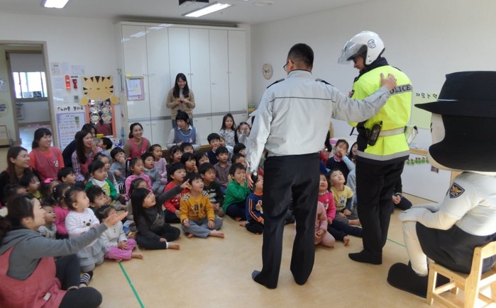 이날 교육은 홍보담당 교통경찰관이 구립어린이집 원생 72명을 대상으로 무단횡단으로 인한 교통사고예방 및 어린이 통학버스에서 안전하게 내리기, 횡단보도 건널 때 좌, 우 살피면서 안전하게 건너기, 안전띠착용하기 등 교통안전교육이 진행됐다.