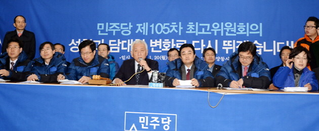 20일 오전 광주 서구 양동시장 3층 회의실에서 민주당 김한길 대표 등 최고위원들이 ‘제105차 최고위원회의’를 열고 있다.