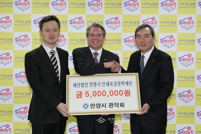 [시민일보]20일 경기도 안양시 관악회는 최대호 안양시장을 만나 안양시인재육성장학금으로 500만원의 장학증서를 전달했다. 사진은 최현섭 국민건강보험공단 안양동안지사장과 박흥규 변호사가 최 시장에게 장학증서를 전달하는 모습.