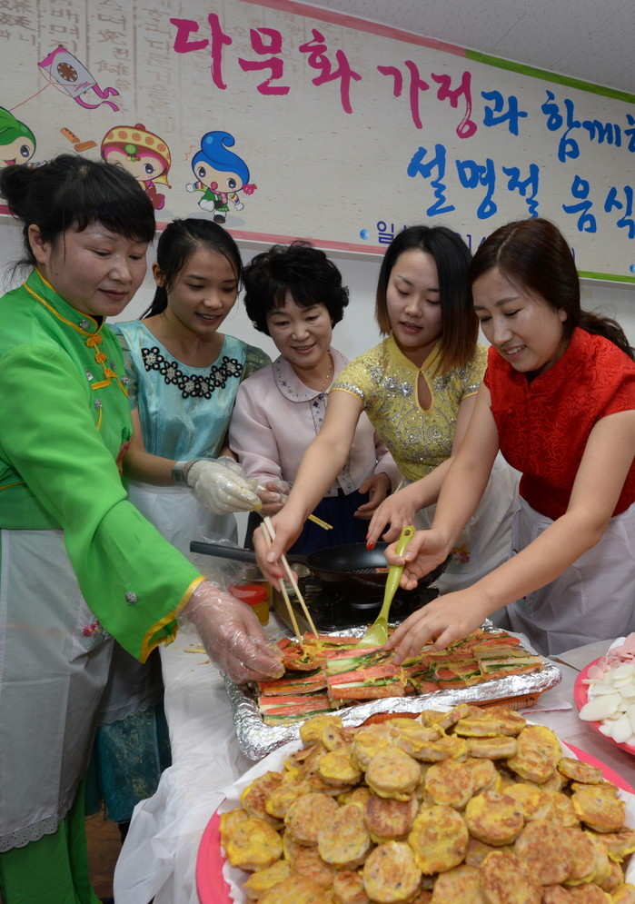 설명절을 앞둔 20일 낮 대구시 달서구 성당동 주민센터에서 결혼이민여성들과 지역 주민들이 함께 전 부치기, 삼색 떡가래 썰기 등 한국전통음식 만들기 체험을 하고 있다.