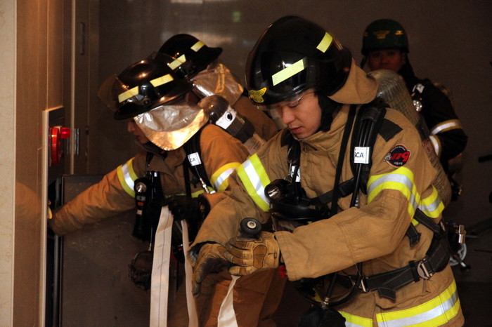 서울 용산소방서 소방대원들이 21일 서울 용산구 한강로3가에 위치한 한 초고층건축물에서 불시 기동출동훈련을 하고 있다.