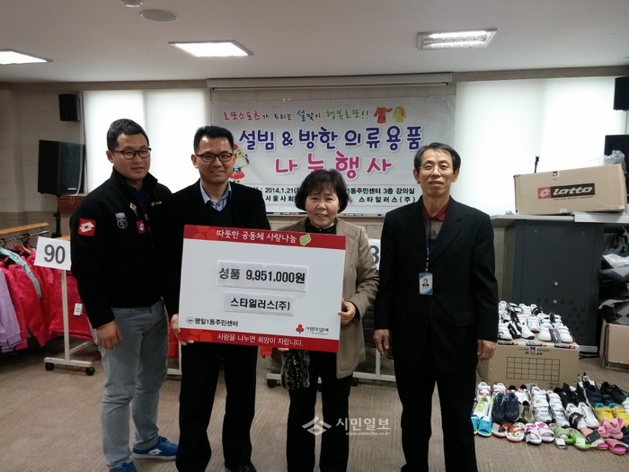 [시민일보]지난 21일 서울 강동구 명일1동 주민센터에서 스타일러스(주)가 1000여만원 상당의 방한 의류를 지역내 저소득층 100여가구에 전달하는 나눔 행사를 열고 봉사활동을 실시했다. 사진은 의류 나눔 전달식에 참여한 스타일러스와 동 주민센터 관계자들의 모습.