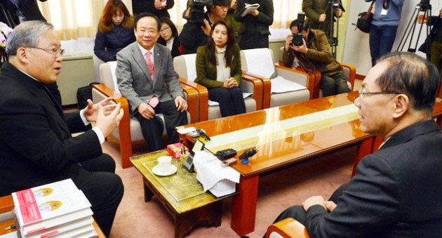 황우여 대표 등 새누리당 의원단이 22일 오전 서울 중구 명동성당 사제관에서 염수정 추기경을 예방하고 있다.