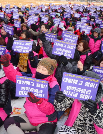 22일 오후 세종시 정부세종청사 교육부 앞에서 열린 전국학교비정규직노동조합 간부결의대회에서 참석자들이 구호를 외치고 있다.