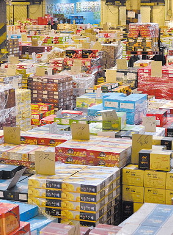 설 연휴를 일주일 앞둔 23일 오후 서울 송파구 가락동 농수산물도매시장 청과물공판장에서 관계자들이 분주한 모습을 보이고 있다.