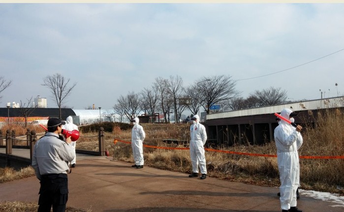 | ▲ 남동서 직원들이 조류인플루엔자에 예방에 대비한 시민통제 훈련을 하고 있다. | ||
