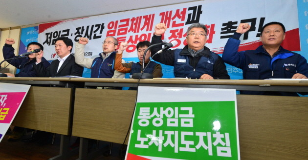 24일 오후 서울 중구 전국민주노동조합총연맹에서 열린 '저임금ㆍ장시간 임금체계 개선! 통상임금 정상화 촉구 기자회견'에서 신승철 민주노총 위원장 등 관계자들이 구호를 외치고 있다. 이들은 기자회견에서 "민주노총은 정부에 통상임금 산정지침 개정을 요구했으나 받아들여지지 않았다"며 "비정상적인 통상임금, 투쟁으로 정상화할 것"이라고 밝혔다.