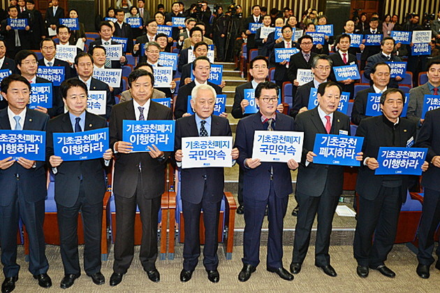 24일 오후 기초선거 정당공천폐지 촉구 결의대회가 열린 서울 여의도 국회 246호실에서 김한길(왼쪽 네번째) 민주당 대표와 기초단체장들이 구호를 외치고 있다.