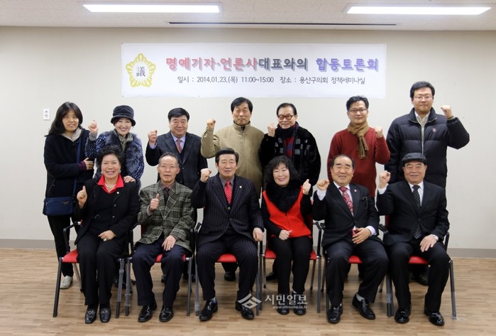 [시민일보]서울 용산구의회는 지난 23일 용산구의회 정책세미나실에서 의회 명예기자의 적극 참여 유도와 상호 소통 강화를 위해 명예기자 및 지역 언론사 대표와의 합동 토론회를 개최했다. 사진은 박석규 용산구의장(앞줄 왼쪽 세번째) 및 지역 언론사 대표, 의회 명예기자들이 기념촬영을 하는 모습.